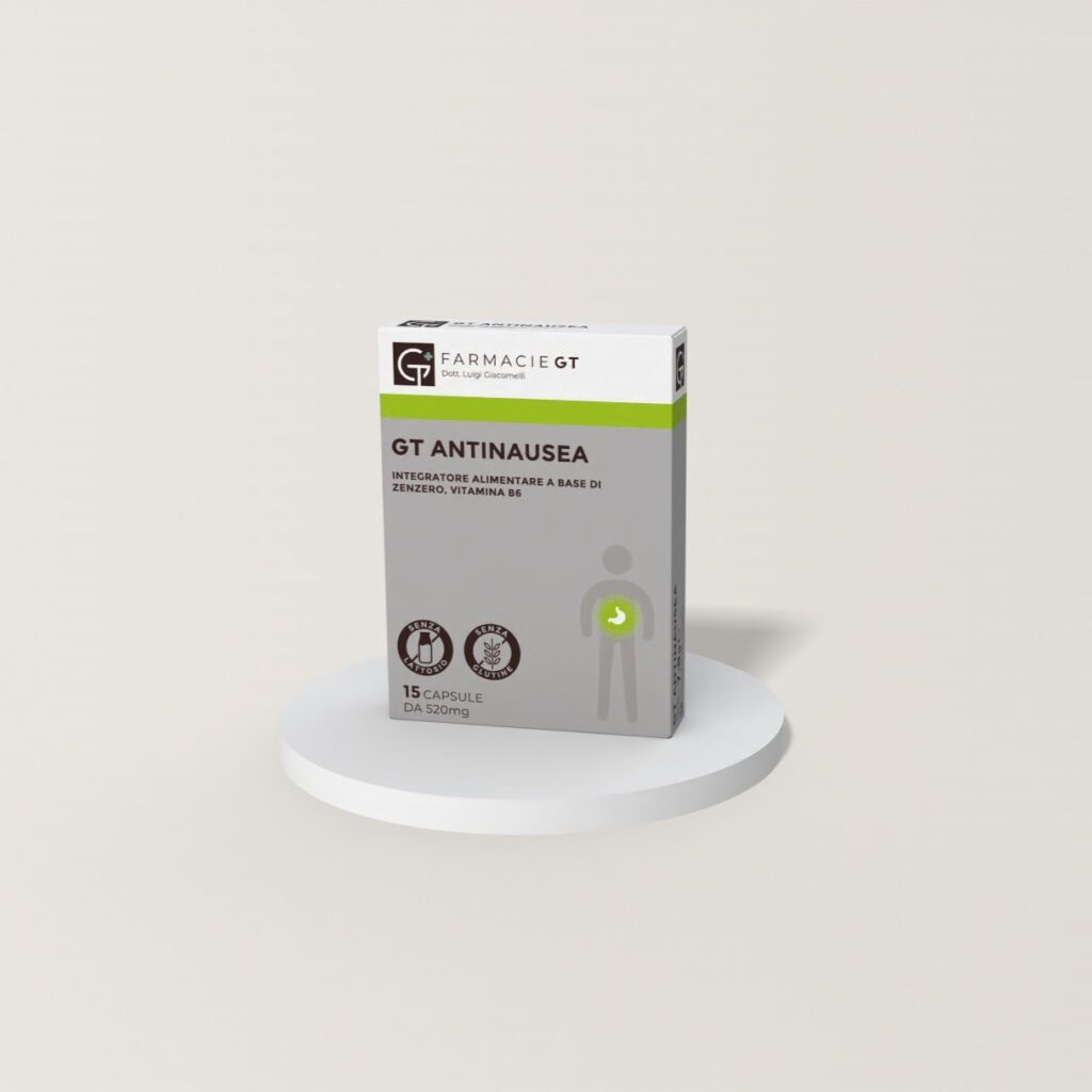 GT Antinausea è un integratore alimentare studiato per contrastare in modo naturale nausea e disturbi digestivi. La sua formula contiene Zenzero, radice nota per le sue proprietà antinausea e digestive, particolarmente efficace contro il mal d’auto, la nausea mattutina e i disturbi gastrici.