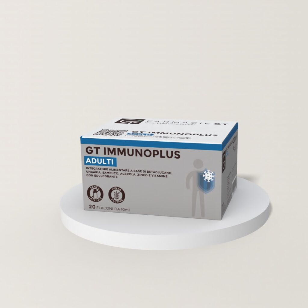 GT Immunoplus Adulti è un integratore con Betaglucano, Uncaria, Sambuco, Acerola, Zinco e vitamine, studiato per rafforzare le difese immunitarie e il benessere generale.