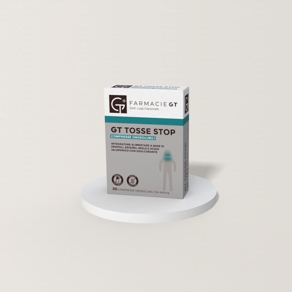 GT Tosse Stop è un integratore in compresse orosolubili con Propoli, Erisimo, Miele e Acido Ialuronico, studiato per il benessere di gola e vie respiratorie.