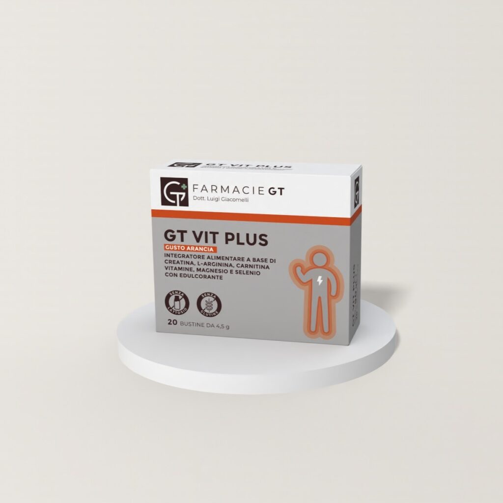 GT Vit Plus è un integratore completo con Creatina, L-Arginina, Carnitina, vitamine, Magnesio e Selenio, studiato per sostenere energia, vitalità e benessere generale.